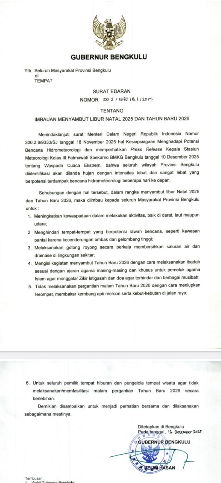 Bengkulu – Gubernur Bengkulu H Helmi Hasan SE menerbitkan surat edaran terkait penyambutan perayaan Hari Natal dan Tahun Baru 2026. Surat edaran bernomor 100.2/1978/B.I Tahun 2025 tertanggal 16 Desember 2025 tersebut memuat enam poin imbauan kepada masyarakat.