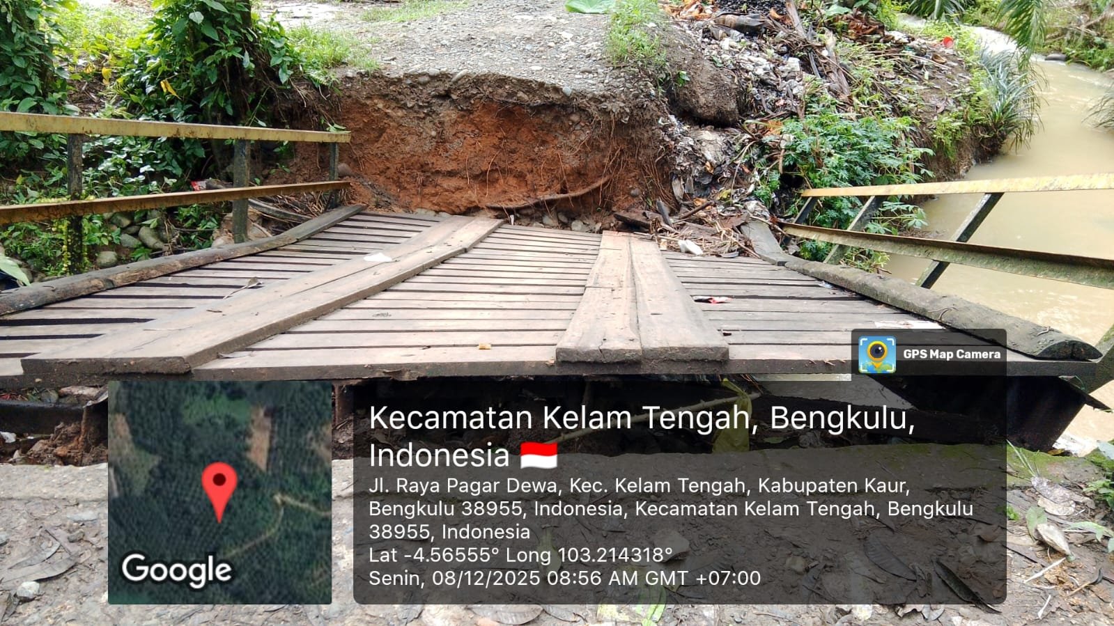 Kaur – Bencana alam kembali melanda Kabupaten Kaur. Jembatan sentra pertanian Air Seranjangan Kecil di Desa Penantian, Kecamatan Kelam Tengah, yang menjadi akses vital bagi sedikitnya lima desa—Darat Sawah, Penantian, Siring Agung, Talang Tais, dan Talang Marap, putus total akibat derasnya luapan sungai yang melanda wilayah tersebut, Minggu sore (7/12/2025) sekitar pukul 17.00 WIB.