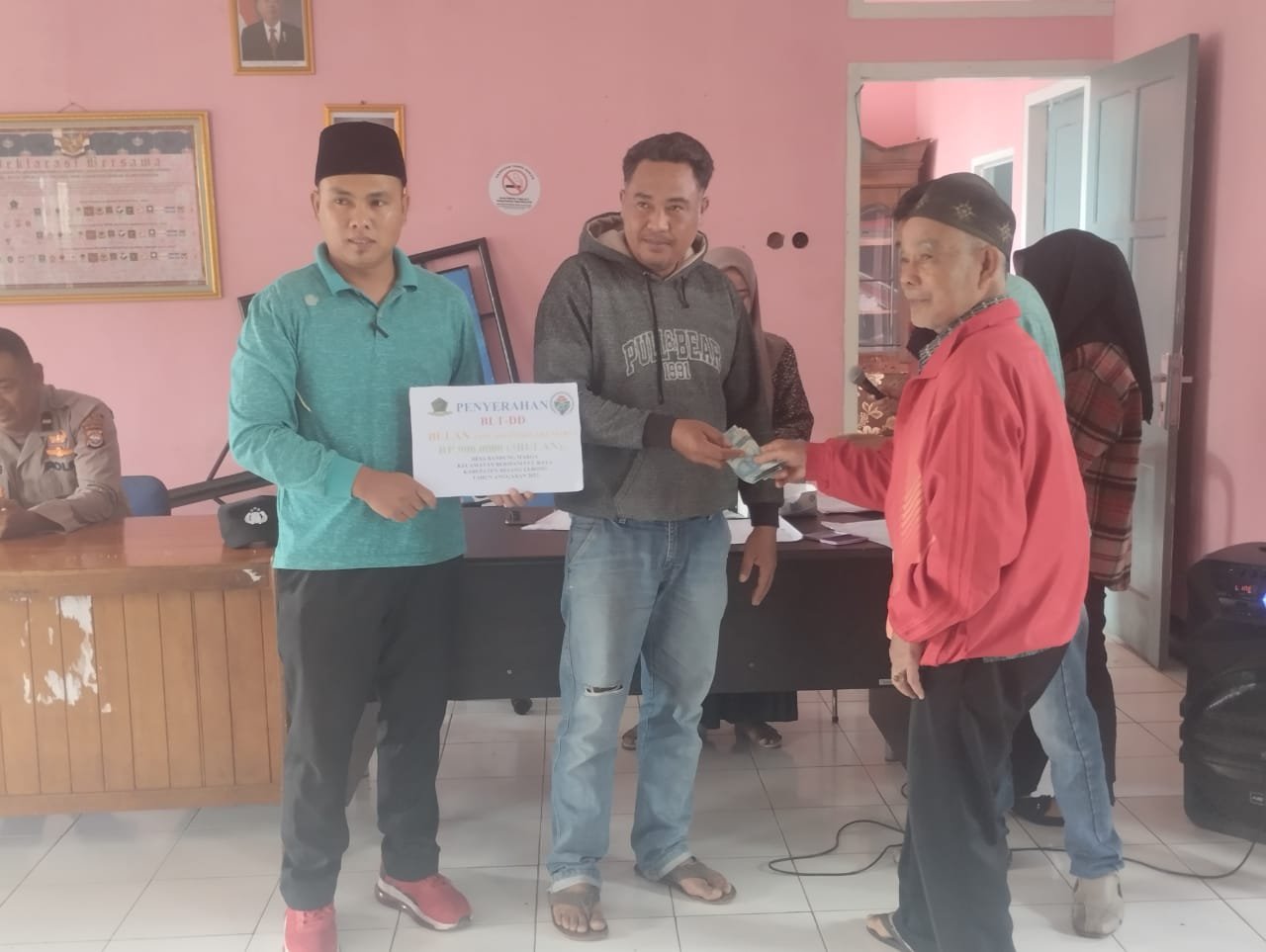 Penyaluran BLT DD kali ini dihadiri langsung oleh Kepala Desa Redi Pransiska, S.Pd., Bhabinkamtibmas Berry, PLD Maus, Ketua BPD Indra Jonaidi serta anggota, Sekdes Via Suganda, S.E., Kaur Keuangan Nadya Nopri. P. Kadus 1 sampai Kadus 3 dan perangkat desa lainnya.