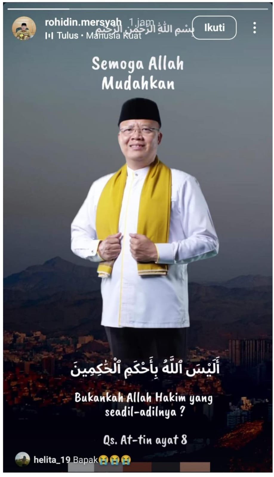 Sebelum persidangan dimulai, akun Instagram Rohidin Mersyah mengunggah story religius. Dalam unggahan tersebut, ia terlihat mengenakan pakaian putih, kopiah hitam, dan syal kuning di leher, disertai dengan lagu “Manusia Kuat” dari Tulus serta potongan ayat dari Surah At-Tin ayat 8 yang berbunyi, “Bukankah Allah Hakim yang seadil-adilnya”.