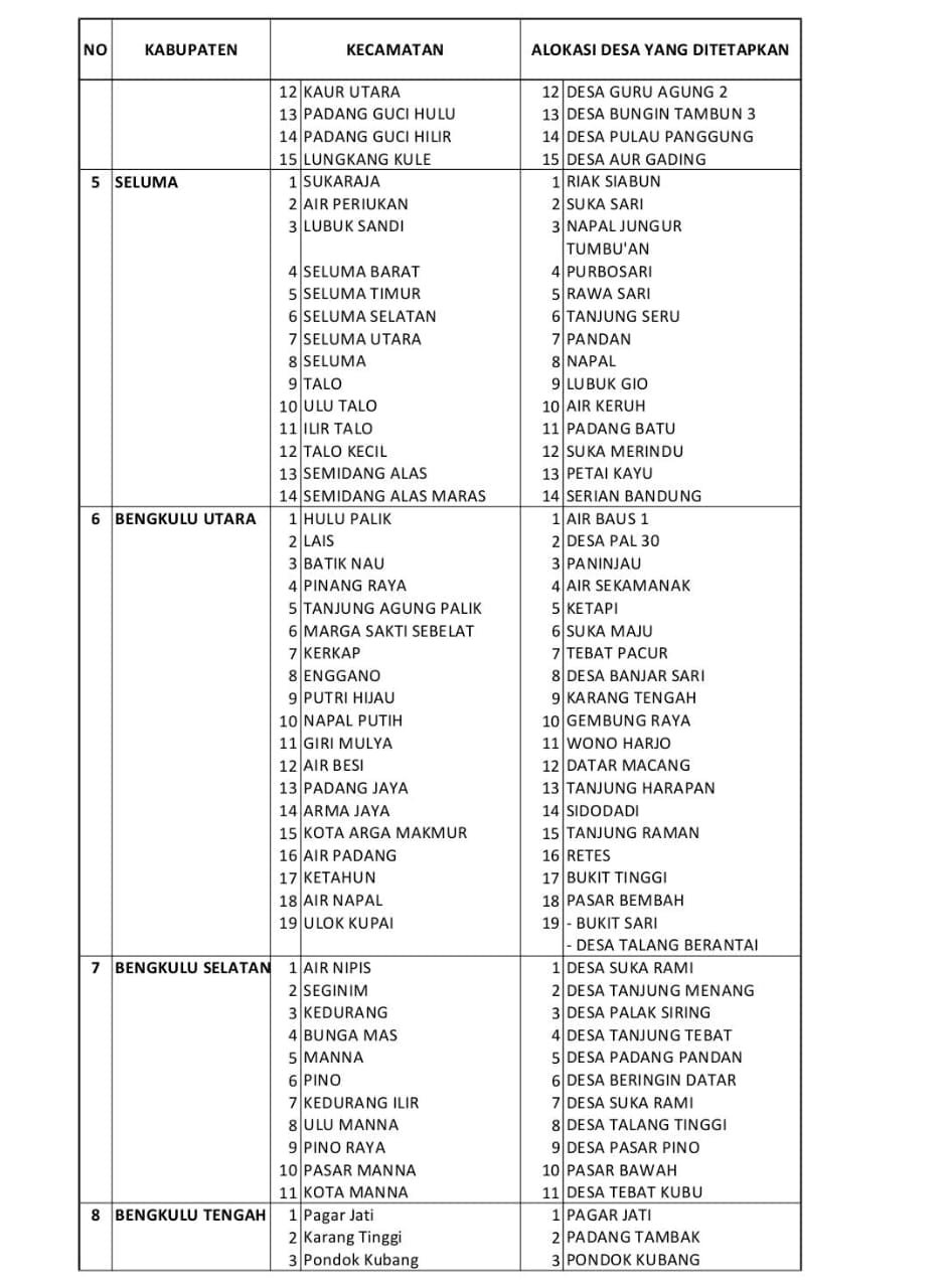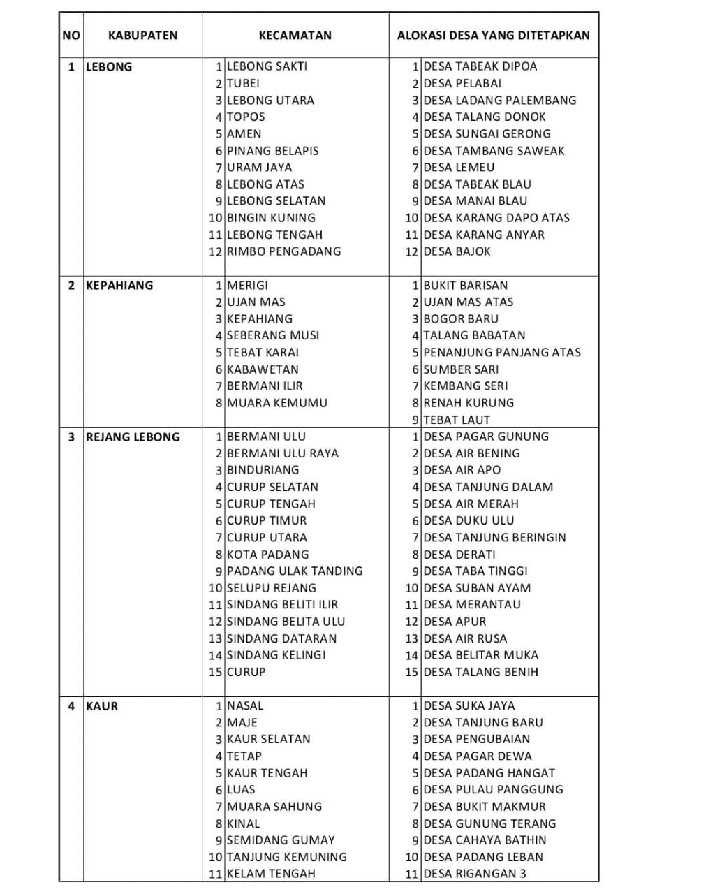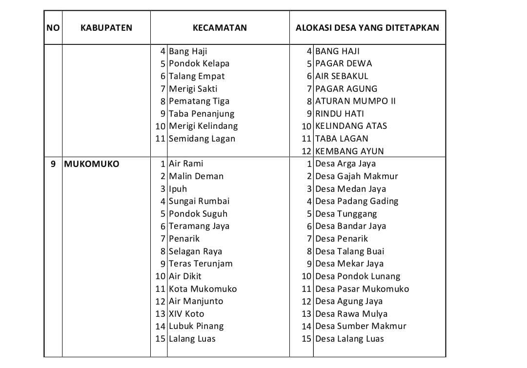 Bantuan ini akan dialokasikan kepada desa dan kelurahan di seluruh kabupaten di Provinsi Bengkulu, yaitu Lebong, Kepahiang, Rejang Lebong, Kaur, Seluma, Bengkulu Utara, Bengkulu Selatan, Bengkulu Tengah, dan Mukomuko.