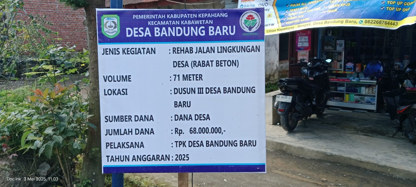 Kepahiang – Pemerintah Desa Bandung Baru, Kecamatan Kabawetan, Kabupaten Kepahiang, mulai mengerjakan pembangunan jalan rabat beton di Dusun Tiga. Proyek ini menggunakan Dana Desa Tahun Anggaran 2025 dengan anggaran sebesar Rp68 juta.
