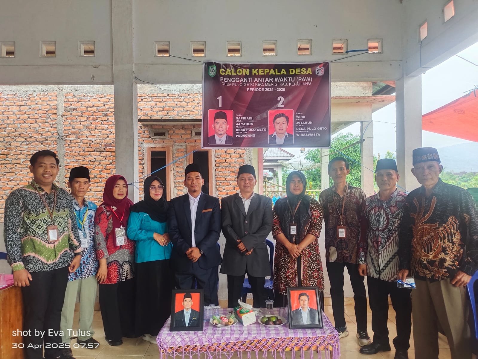 Kepahiang – Pemilihan Kepala Desa Pengganti Antar Waktu (PAW) Desa Pulo Geto, Kecamatan Merigi, Kabupaten Kepahiang, berlangsung sukses dan kondusif pada Rabu, 30 April 2025. Dalam pemilihan tersebut, Sapriadi berhasil keluar sebagai pemenang dengan meraih 249 suara, unggul telak dari lawannya Wira yang memperoleh 122 suara.