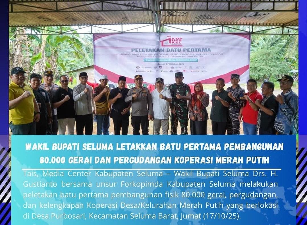 Seluma – Wakil Bupati Seluma, Drs. H. Gustianto, bersama unsur Forkopimda Kabupaten Seluma, melakukan peletakan batu pertama pembangunan 80.000 gerai, pergudangan, dan sarana pendukung Koperasi Desa/Kelurahan Merah Putih di Desa Purbosari, Kecamatan Seluma Barat, pada Jumat (17/10/2025).